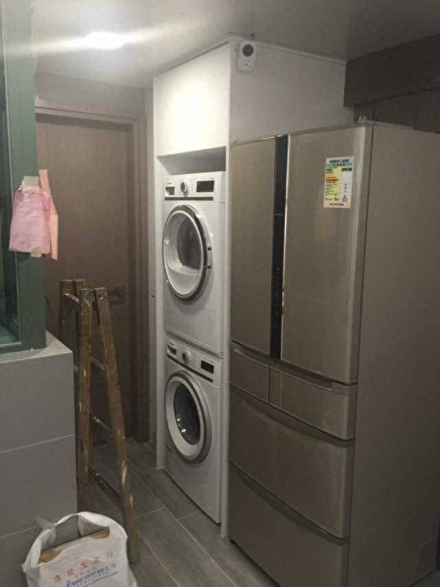 厨房旁边的位置设置了柜子,放置了洗衣机、烘干机以及双开门大冰箱。