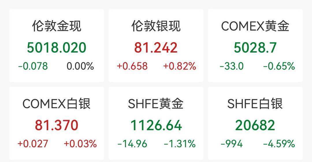 截至发稿,黄金白银悉数反弹。伦敦金现持平,报5018.02美元/盎司;COMEX黄金跌0.65%,报5028.7美元/盎司;伦敦银现涨0.82%,报81.242美元/盎司;COMEX白银涨0.03%,报81.37美元/盎司。